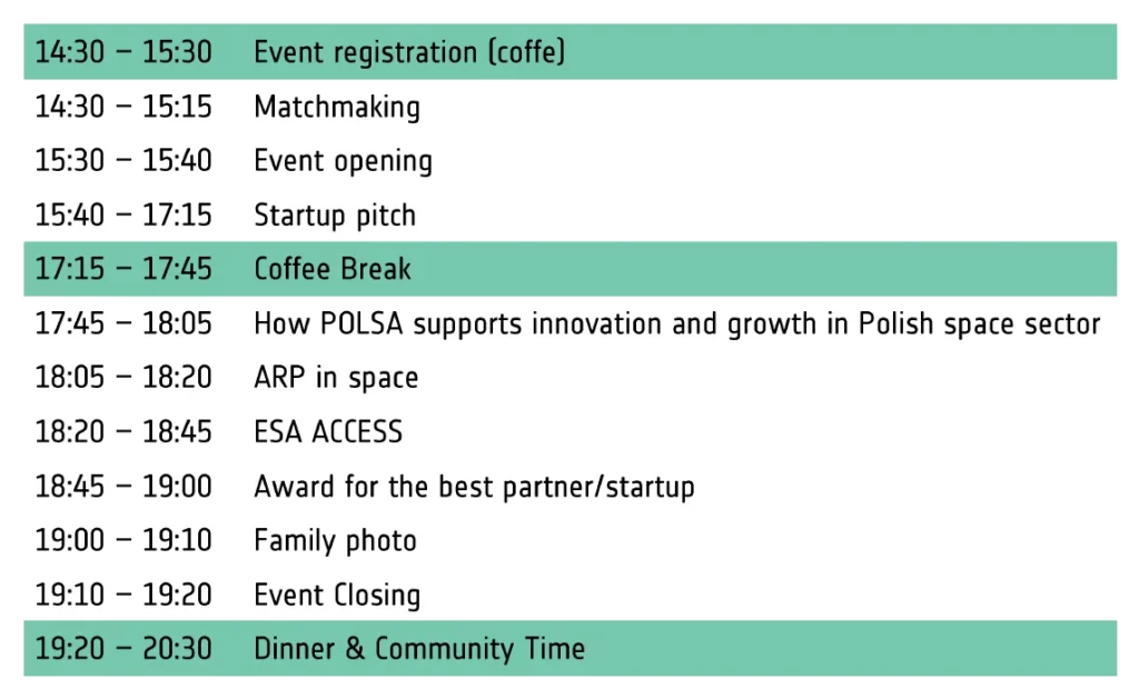 The programme will be complemented by additional elements, including a presentation from the Polish Space Agency (POLSA), an overview of the opportunities and engagement of the Industrial Development Agency (ARP) in the space sector, and a presentation of the ESA ACCESS support offer. The event will conclude with networking, creating a friendly setting for informal discussions with partners, industry experts and investors — a valuable opportunity to build relationships that may lead to future cooperation and new initiatives within the Polish space ecosystem.